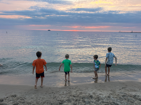 It wasn't riptide status, but without his usual life jacket, my little boy began to panic. The current was faster than any of us realized. Apparently it didn't affect the older kids the same way. I tried to calm him, saying, "Stand up. Just stand up. Use your feet. It's not deep." Instead of trying to stand, my six-year old frantically grappled for something to hold onto. The smooth, algae-covered rocks and slimy, sinking sand below his feet caused him to rip off more than half of his fingernails. He screamed louder. What could I do but drop everything and slide down to pick him up before he traumatically went out deeper water. Somehow in the process of my drop, I broke my wrist. Obviously I have no regrets or blame because my son was safe minus some bloody fingers.